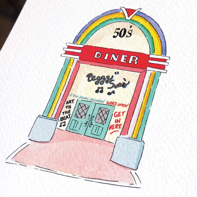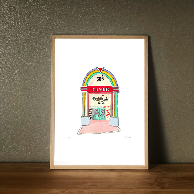 Bring the charm of the American 1950s into your space with this nostalgic art print of Peggy Sue’s retro diner. Featuring a classic jukebox and soft pastel colors, this piece is a tribute to the golden age of milkshakes, rock ‘n’ roll, and vinyl records.
