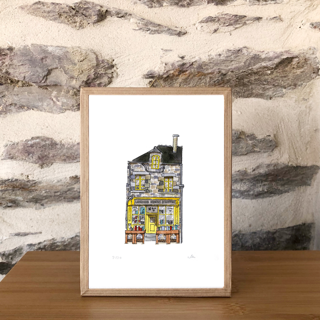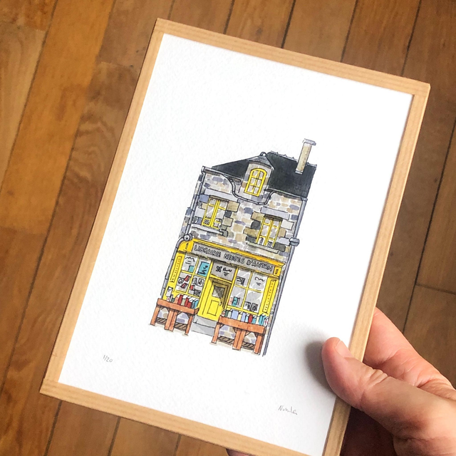 Inspired by the charming bookshops of Bécherel, Brittany’s very own “book town,” this watercolor captures the quiet magic of browsing old books on a rainy day in France. A lovely gift for readers, travelers, and cozy-home lovers alike.