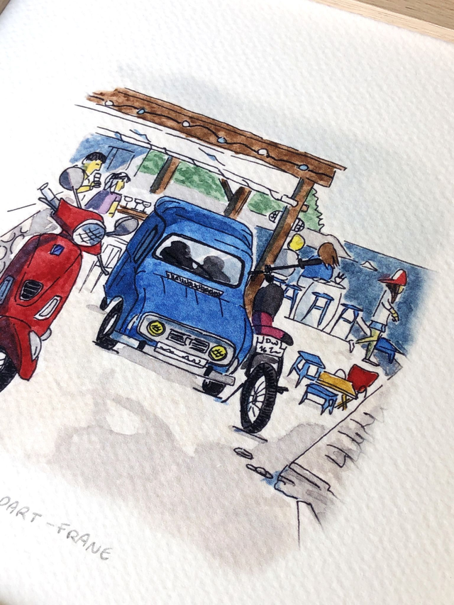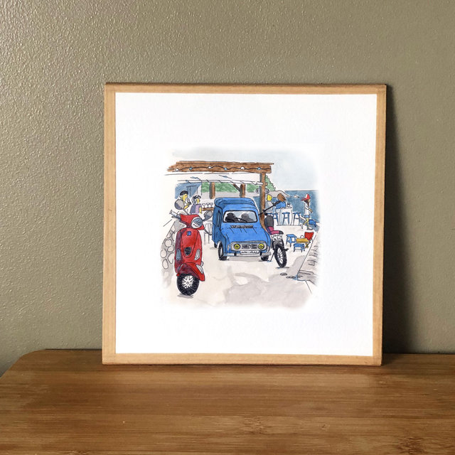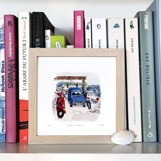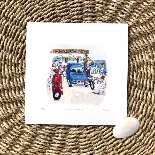 Discover our Art Print of a Restaurant in Bidart, Pays Basque, a charming illustration that captures the essence of this well-known surfing spot in Southwest France. This limited edition art print showcases an original watercolor of a quaint restaurant, perfect for anyone who appreciates artistry or has a love for the Basque Country.