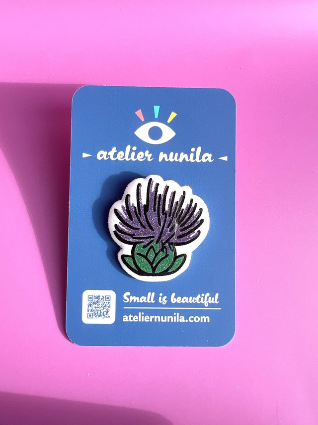 A bold little bloom with plenty of attitude! This glittery thistle pin shines with vibrant colors and subtle sparkles, inspired by the iconic Scottish wild thistle. Handmade from plastic, glitter, and resin, it’s a unique accessory for botanical lovers, Scotland fans, or anyone who enjoys quirky, nature-inspired jewelry. Add it to a jacket, scarf, or bag for a touch of floral sparkle — without the prickles.