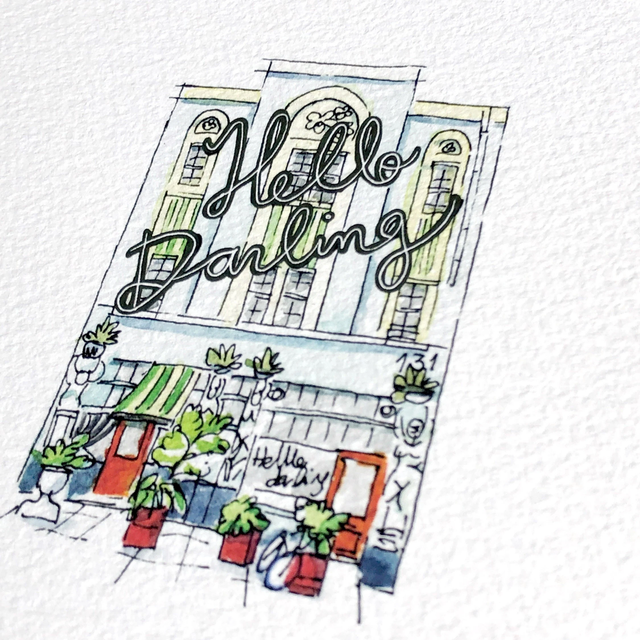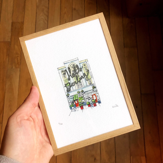 Step into the floral elegance of London’s Waterloo district with this illustrated art print of Hello Darling, a beloved café-restaurant known for its blooming façade and ambient glow. This watercolor-inspired artwork brings a slice of city romance and cozy sophistication to your interior.