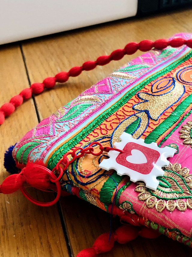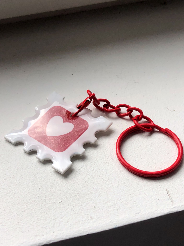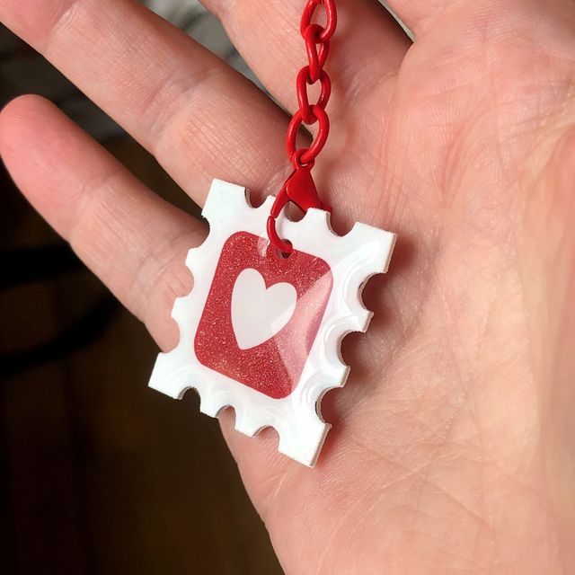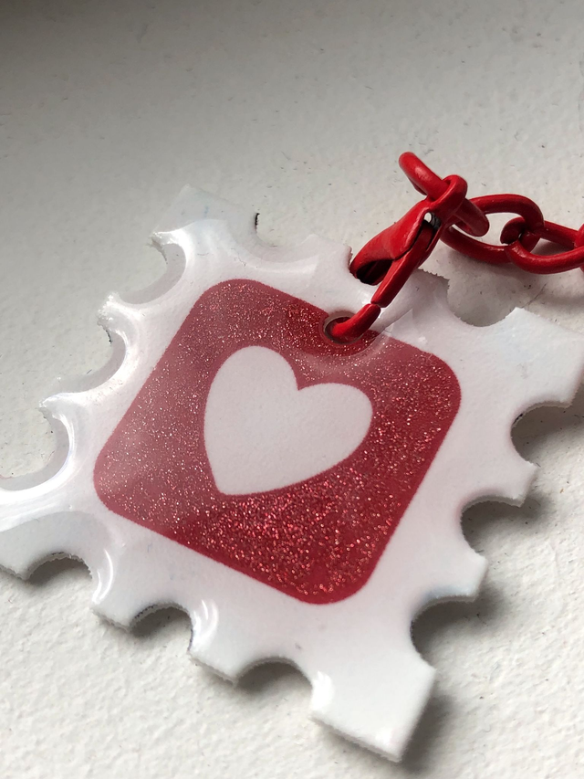 This handmade charm shaped like a postage stamp sparkles with red glitter, bringing a dose of sweetness and charm wherever it hangs. Clip it to your bag or keys for a playful and heartfelt touch. Perfect for Valentine’s Day, anniversaries, or a spontaneous “thinking of you” gift, this accessory is made entirely by hand — so each one is as unique as your love.