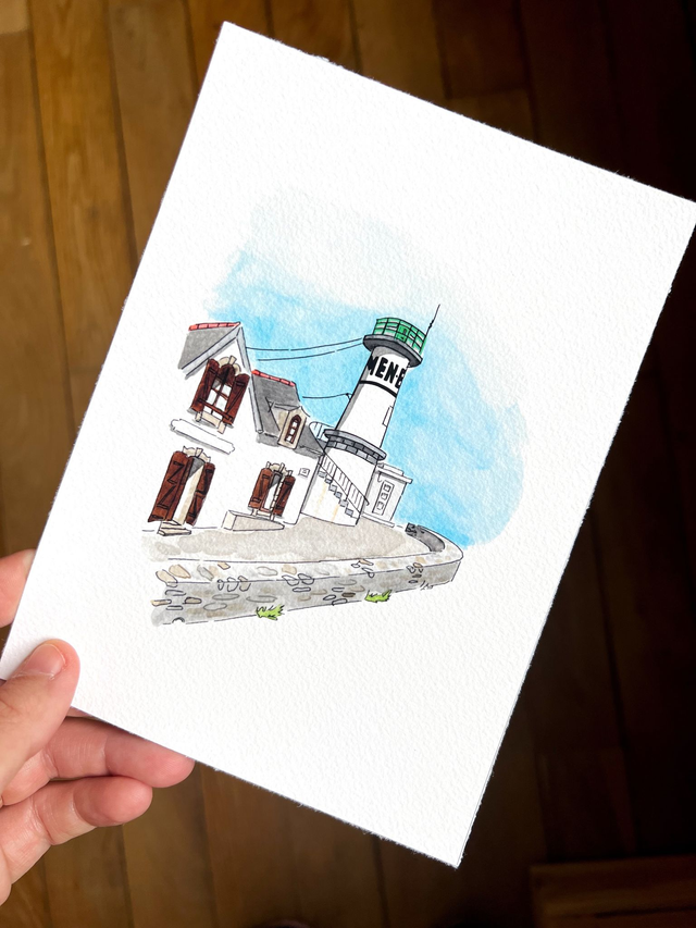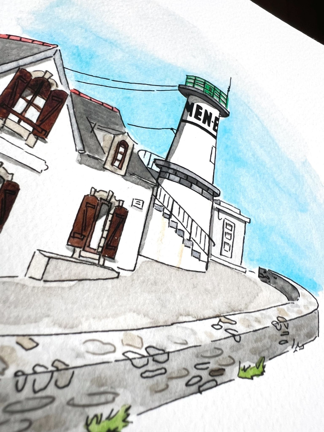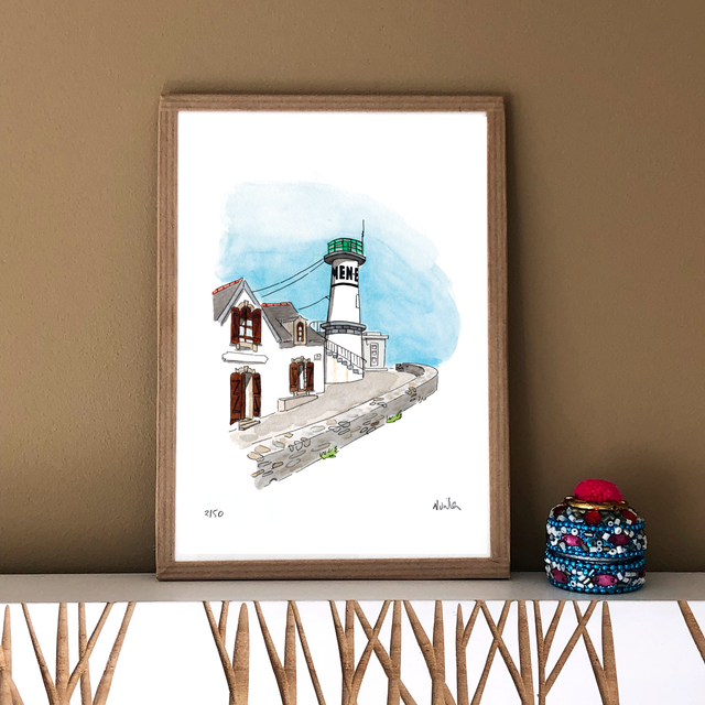 The Men Brial lighthouse is one of Brittany’s most legendary maritime icons. Standing guard at the entrance of the Île de Sein, near the pier and its cluster of white houses, it has guided sailors through the wild Atlantic for over a century. This watercolor-inspired 13×18 cm art print captures the striking silhouette of the lighthouse, the charm of the island homes, and the authentic coastal atmosphere of Brittany. Perfect size for small spaces, gallery walls, or as a unique gift for sea lovers and lighthouse enthusiasts.