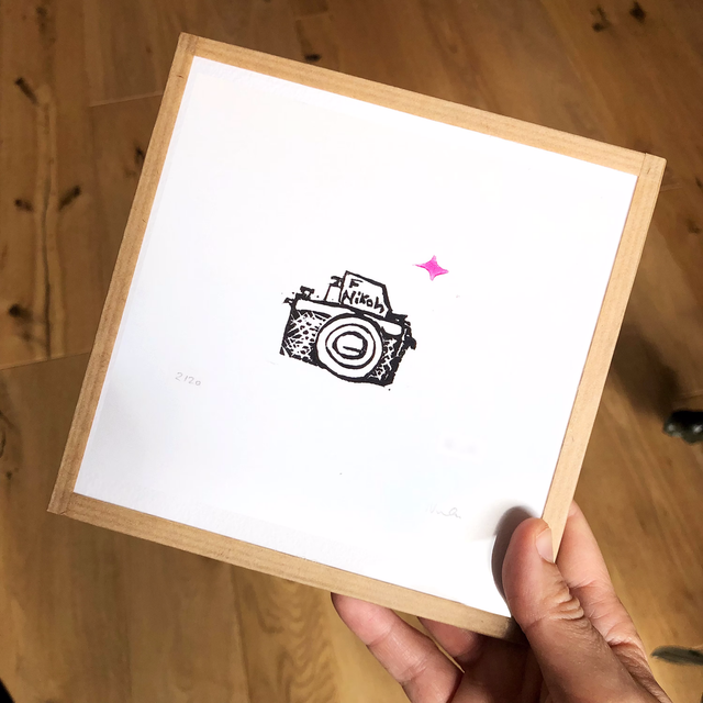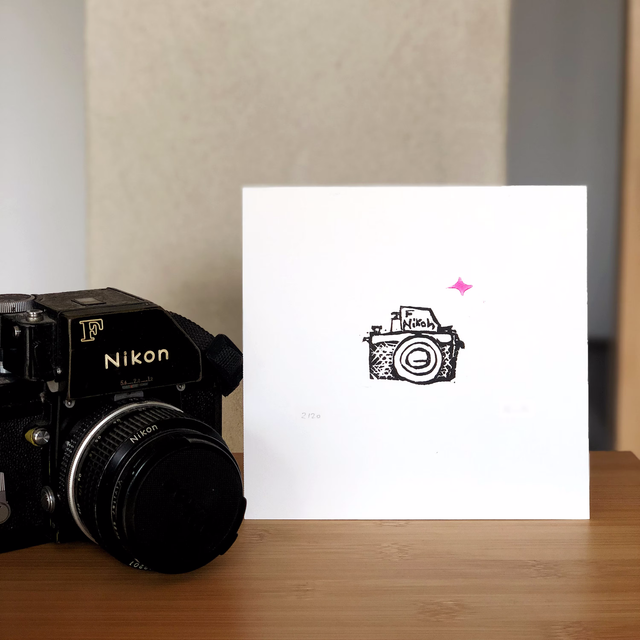Original, limited edition engraving of the Nikon F camera. Handcrafted printing on 160 g acid-free paper. Handcrafted quality means there might be slight variances between prints, due to the linoprint method. The colors of the print may vary from those visible on screen.