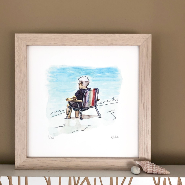 Capture the warmth of seaside nostalgia with this charming watercolor art print, featuring a grandmother enjoying a quiet moment at the beach in Greece. This scene radiates joy, simplicity, and the timeless beauty of Mediterranean summers. Whether you're decorating a coastal-themed room or looking for a heartfelt gift, this print adds a gentle, personal touch to any space.