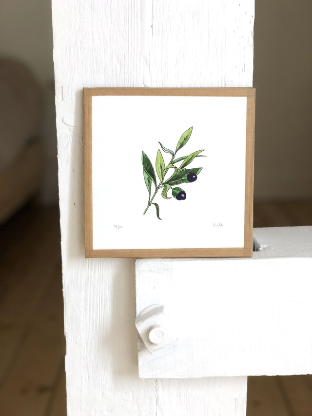 This art print features a captivating watercolor illustration of an olive tree branch, perfect for adding a touch of natural elegance to any space. The delicate leaves and rustic charm of the olives are beautifully captured with vibrant colors. Available with optional framing, this timeless piece brings serenity and style to your home or office.