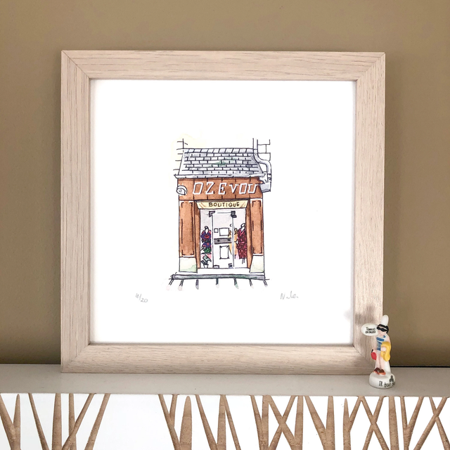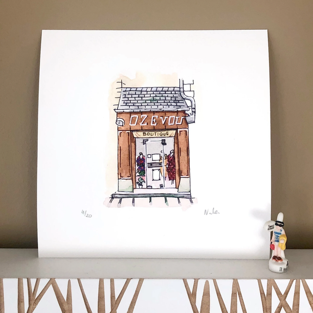 This limited edition watercolor features Ozevou, a vintage clothing boutique in Rennes, France. With its retro charm and soft elegance, this print brings a Parisian flair to your wall — perfect for fashion lovers and vintage decor fans.