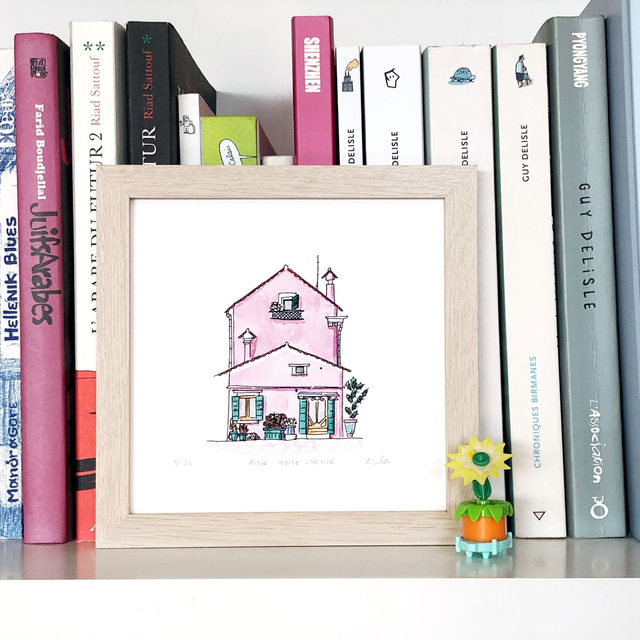 Bring a touch of Mexico's vibrant culture into your home with this charming art print of a lovely pink house. This limited edition print captures the beauty and romance of a new house in Mexico, making it an ideal gift for housewarmings or as a romantic gesture. The watercolor illustration is printed on high-quality Canson watercolor paper in Rennes, France, ensuring vibrant and lasting colors that will brighten up any space.