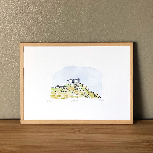 Step into the world of ancient legends with this striking art print of the Poseidon Temple in Sounio, inspired by an original watercolor illustration. Perched dramatically on the cliffs south of Athens, this temple dedicated to the Greek god of the sea, Poseidon, captures the mythical power and timeless elegance of one of Greece’s most iconic sites. A beautiful way to bring classical heritage and divine inspiration into your home.