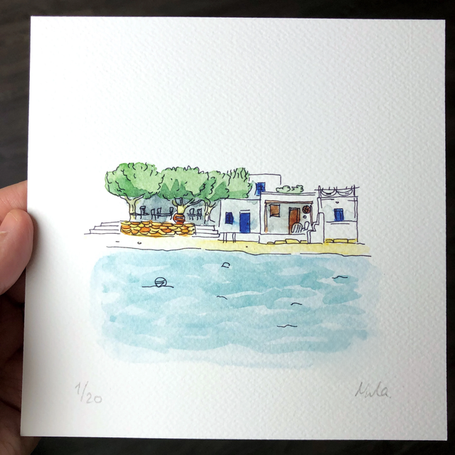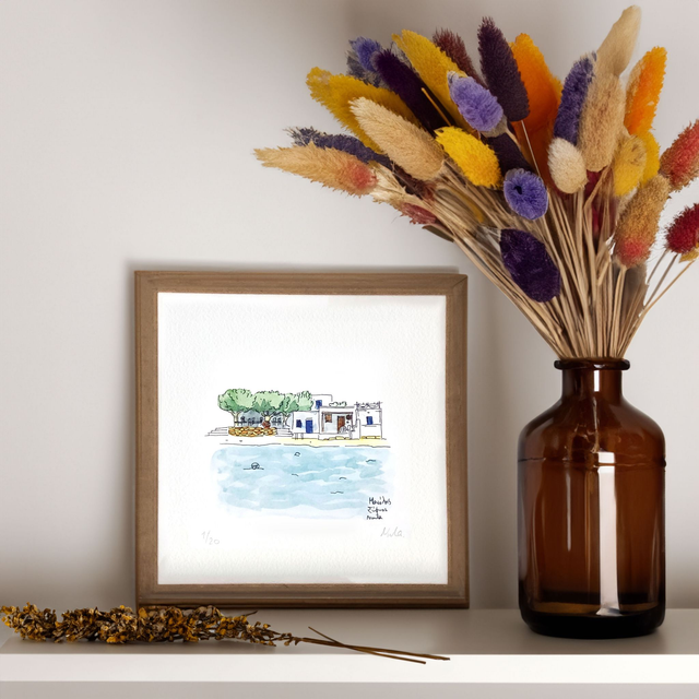 Transport yourself to the enchanting Cycladic islands with this art print of a delicate watercolor of Manolis Taverna in Sifnos, Greece. It captures the warmth of Greek hospitality and the inviting atmosphere of a traditional island taverna. Bring some Mediterranean charm and the spirit of Sifnos right to your wall.