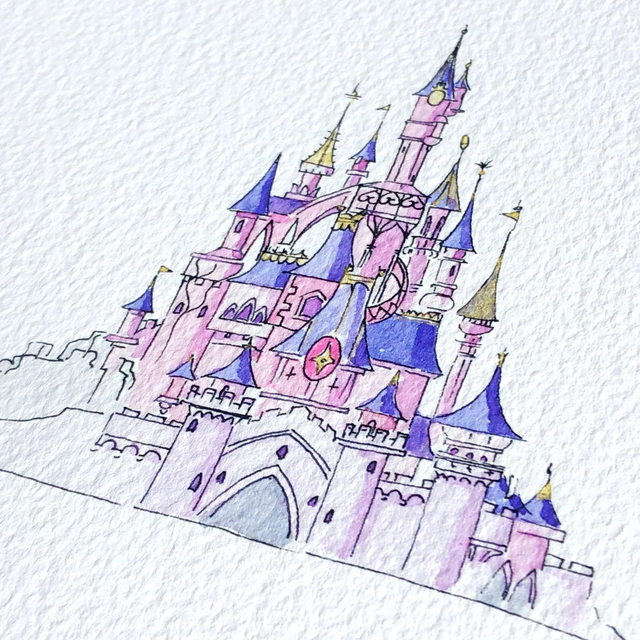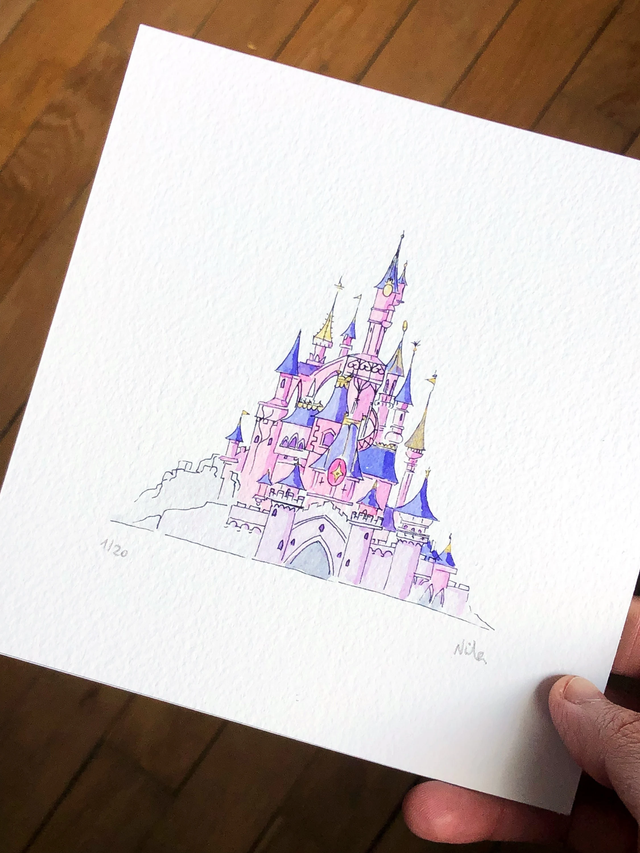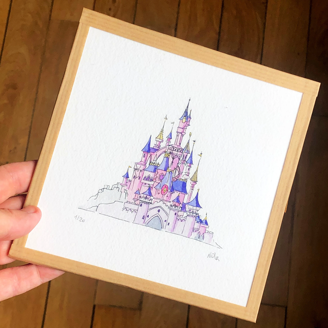 Relive the magic of childhood with this enchanting watercolor art print of a Disney-inspired princess castle. Whether for your daughter, granddaughter, niece, or even your own inner child, this dreamy pink illustration adds a whimsical and elegant touch to any room. Perfect for lovers of fairy tales and legendary cartoons.