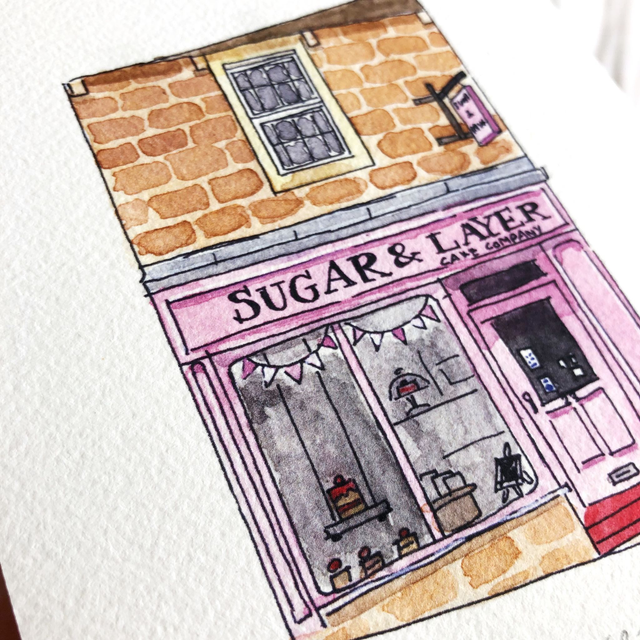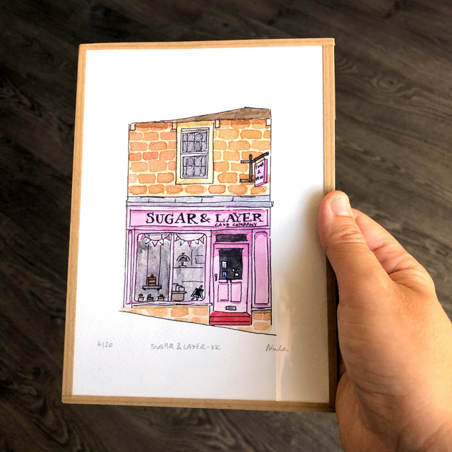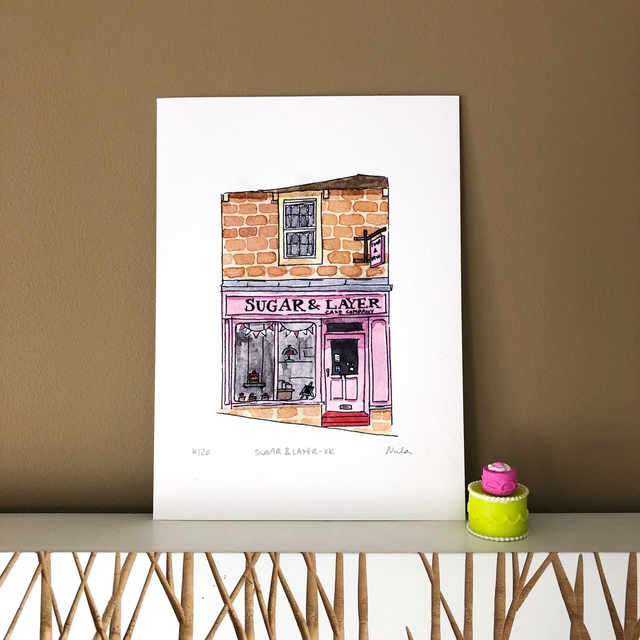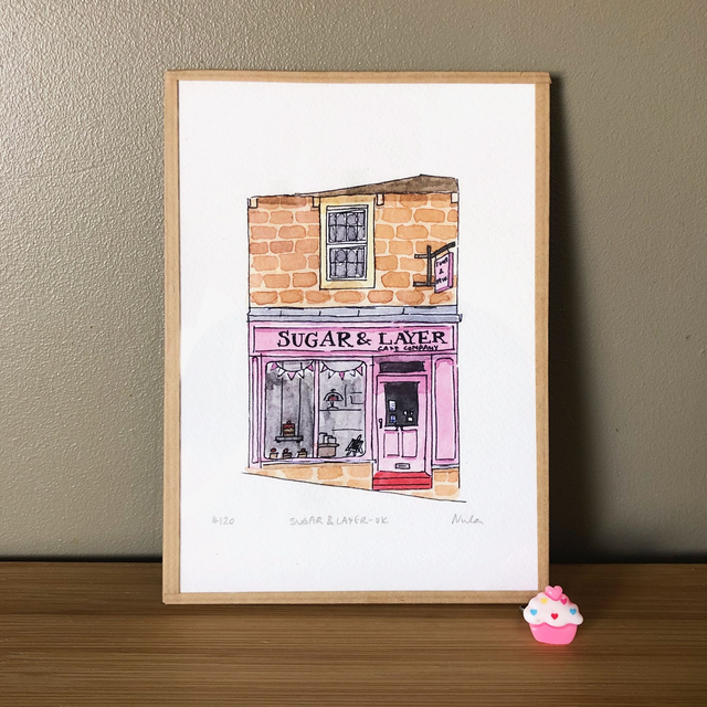 Introducing our Personalized UK Cake Shop Art: Tea Drinker's Delight - the perfect addition to your home decor or an ideal housewarming present for loved ones. This custom tea shop art showcases the charming Sugar and Layer British cake shop in an original watercolor design, capturing the essence of indulgence and sweetness. Let the whimsical allure of delicious treats bring a touch of nostalgia to your space, satisfying your cupcake cravings every day.