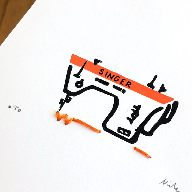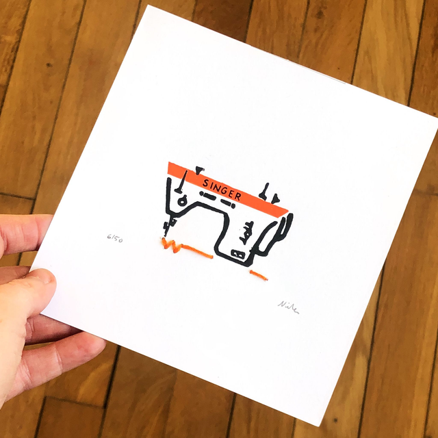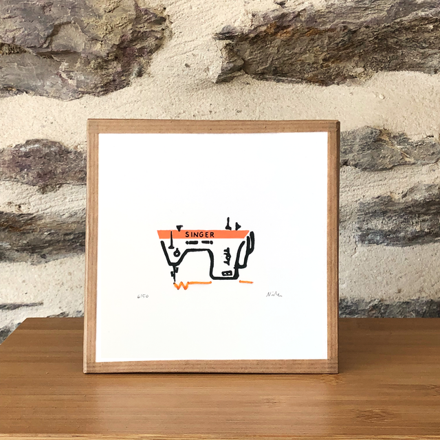Enhance your sewing workshop with this unique engraving of a vintage Singer sewing machine, one of the most iconic in history. Each engraving is adorned with a real sewn cotton thread, adding a handcrafted and authentic touch. This numbered piece of art is ideal as a gift for sewing enthusiasts or as an elegant decoration for a creative space.